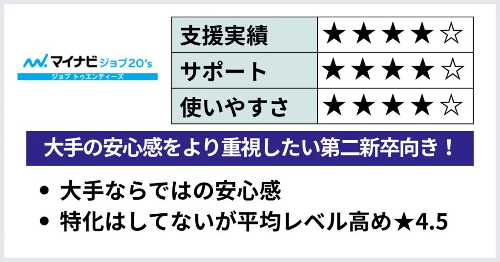 マイナビジョブ20’sは、20代の転職支援に特化した転職エージェントです。大手人材会社マイナビが運営しており、第二新卒や既卒など若手向けの求人を多く扱っています。