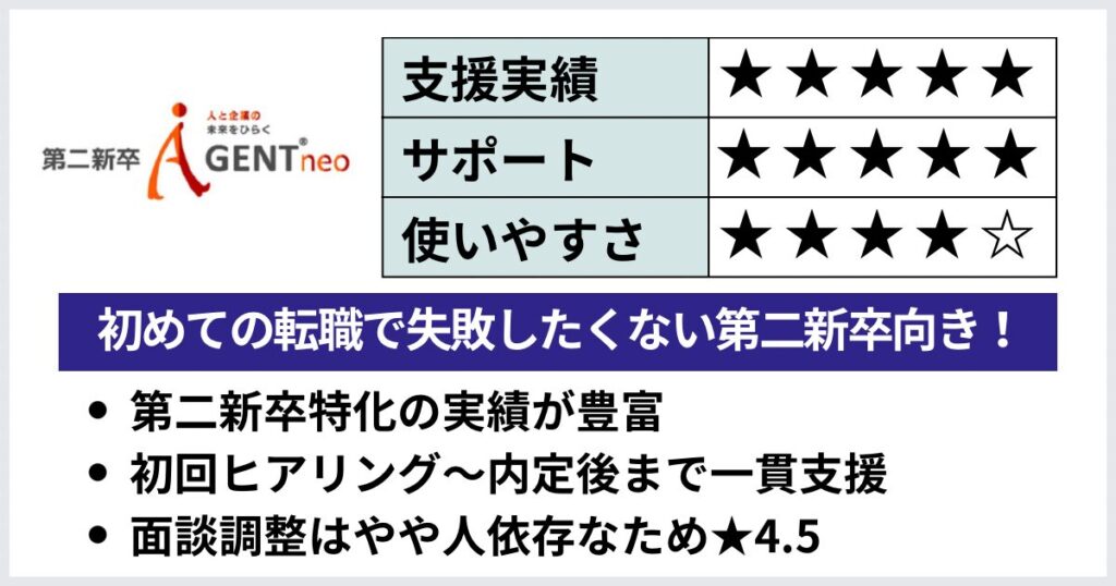 第二新卒エージェントneoは、第二新卒や既卒など若手の転職支援に特化したサービスです。社会人経験が浅い人向けの求人を扱っており、若手人材の転職支援に強みがあります。