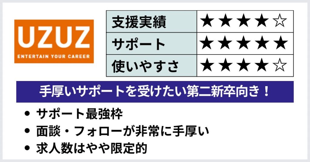 UZUZ(ウズウズ)は、第二新卒や既卒など若手の転職支援を行っているエージェントです。未経験の職種や業界への紹介にも定評があり、サポートの手厚さを重視している点が特徴です。